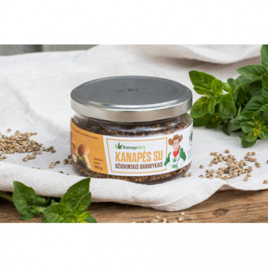 Lukštentos kanapių sėklos, džiovinti baravykai, svogūnai, rapsų aliejus, druska, pipirai.
